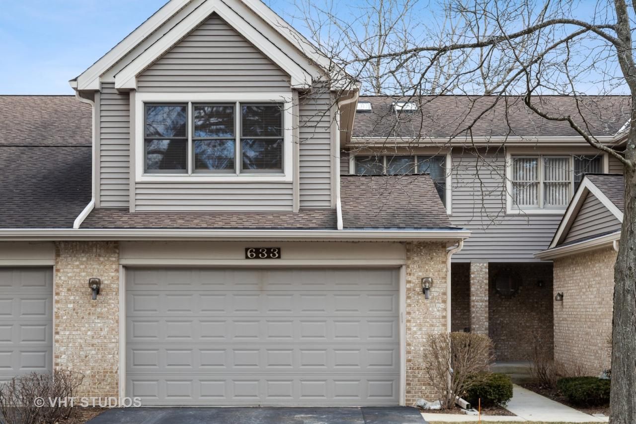 Perfect 10! Nestled amongst the trees, on a quiet and private street. All the updating done for you! Dramatic entry you will appreciate the gleaming wood floors throughout first floor, streaming light from the two story arch windows flanking gorgeous fireplace in voluminous two story living room. Beautiful updated high end kitchen with granite countertops, breakfast bar and all Stainless steel appliances. Huge master bedroom with sitting room, and luxurious master bath. Loft can be converted to 3rd bedroom. Finished Basement with bar! Roof less then 10 years, new siding, gutters with leaf guard, soffit and fascia, Trek deck installed 7 years ago, nothing to do but move in! Excellent location, within minutes of metra, downtown Palatine and expressway. Highly sought after neighborhood with only 69 townhomes, abundant parking and 3 ponds to accent this pretty community.